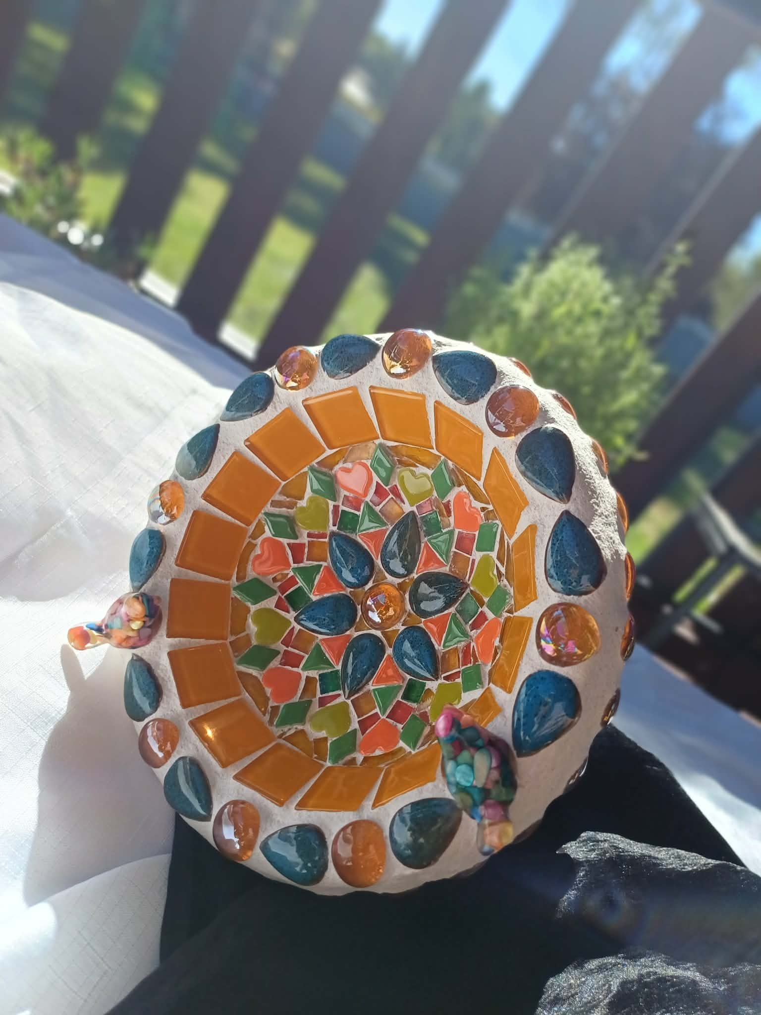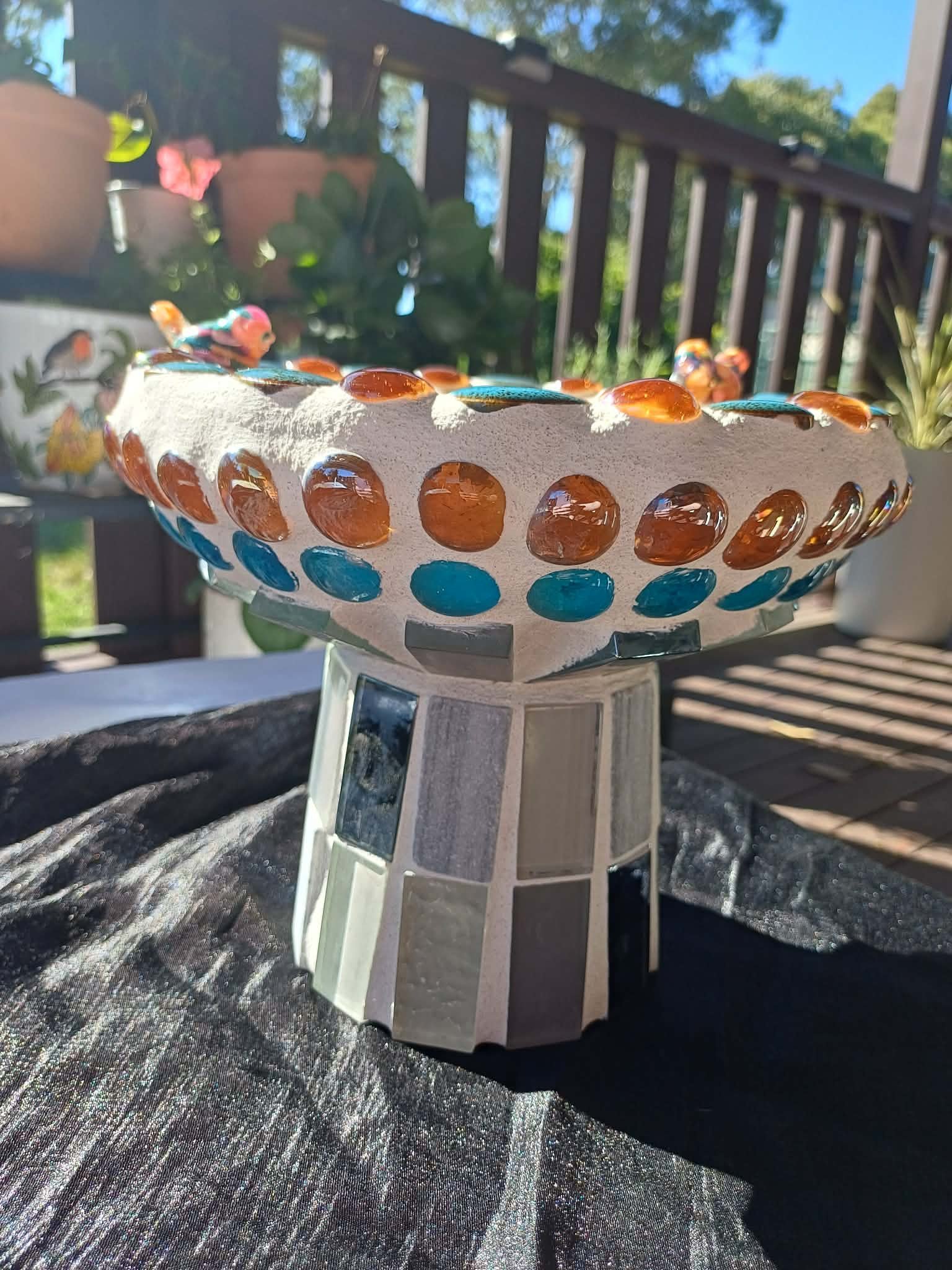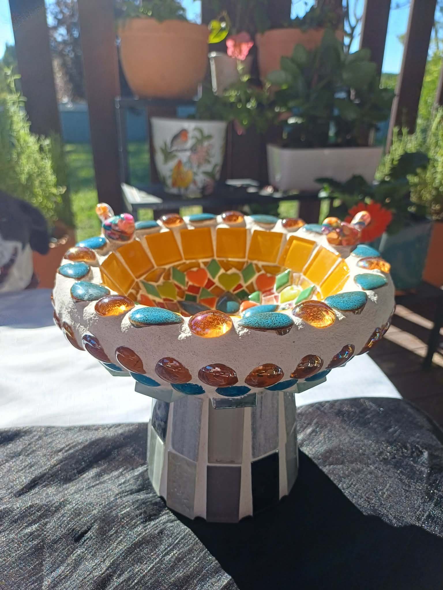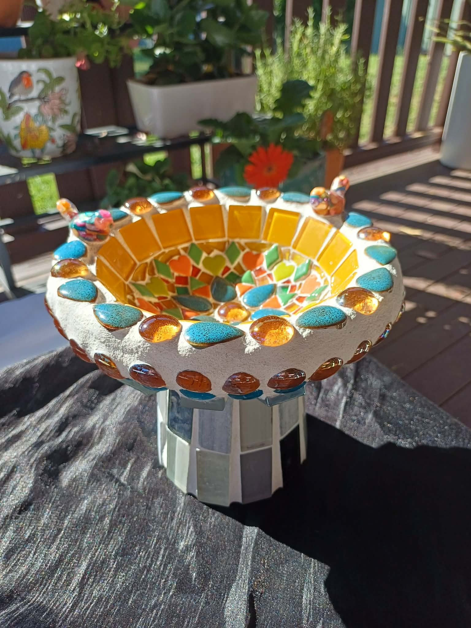 Bee bath with warm amber, sunny yellows and soft blues.